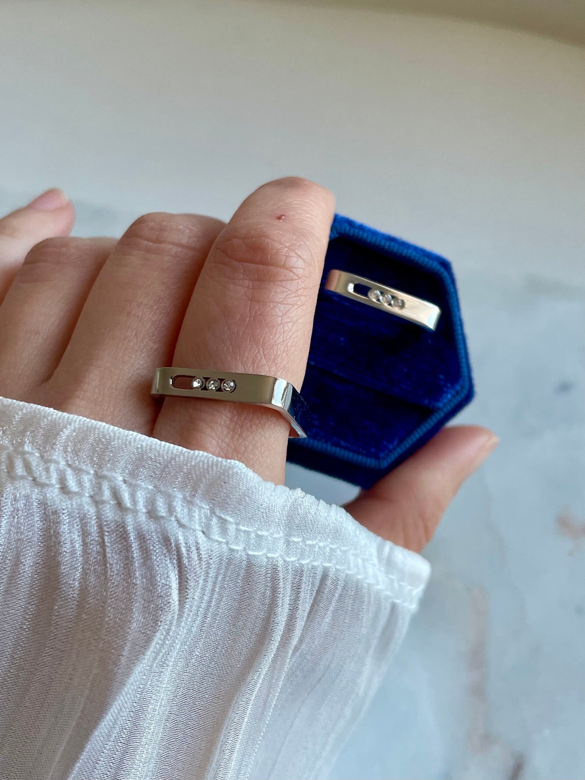 Apportez une touche de raffinement à votre style avec cette superbe bague. Son design épuré met en valeur trois petites pierres étincelantes serties avec finesse dans une encoche rectangulaire au centre de l’anneau.